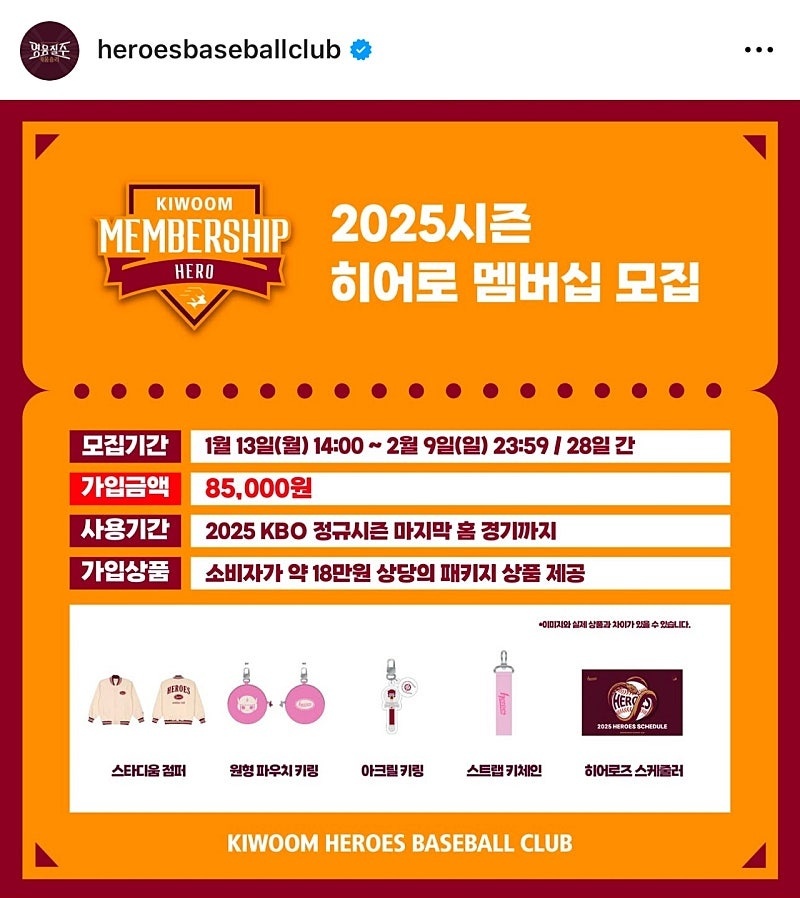 더불어, 히어로 멤버십 가입자에게는 스타디움 점퍼와 파우치 키링, 히어로즈 스케줄러 등 18만 원 상당의 패키지 상품을, 큠린이 멤버십 가입자에게는 유니폼 쇼퍼백, 파우치 키링, 스트랩 키체인 등 소비자가 180,000원 상당의 사은품을 제공합니다. 자세한 상품은 아래 사진을 참고해주세요.
