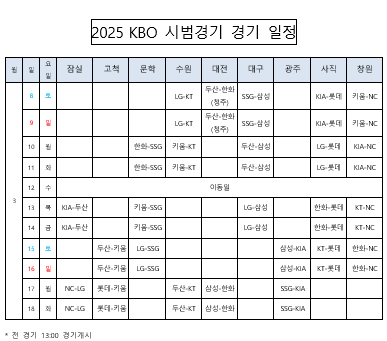 시범경기 일정은 아래 표와 같습니다.